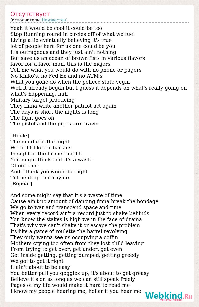 Yeah it would be cool it could be too [bad word] round in circles off of what we fuel Living a lie eventually believing it's [bad word] lot of people here for us one could be you It's outrageous and they just ain't nothing But save us an ocean of brown fists in various flavors favor for a favor man, this is the majors Tell me what you would do with no phone or pagers No Kinko's, no Fed Ex and no ATM's What you gone do when the poliece state vegin Well it already began but I guess it depends on what's really going on what's happening, huh Military target practicing They finna write another patriot act again The days is short the nights is long The fight goes on The pistol and the pipes are drawn [Hook:] The middle of the night We fight like barbarians In sight of the former might You might think that it's a waste Of our time And I think you would be right Till he drop that rhyme [Repeat] And some might say that it's a waste of time Cause ain't no amount of dancing finna break the bondage We go to war and transcend space and time When every record ain't a record just to shake behinds You know the stakes is high we in the face of drama That's why we can't shake it or escape the problem Its like a game of roulette the barrel revolving They only wanna see us occupying a coffin Mothers crying too often from they lost child leaving From trying to get over, get under, get even Get inside getting, getting dumped, getting greedy We got to get it right It ain't about to be easy You better pull you goggles up, it's about to get greasy Believe it's on as long as we can still speak freely Pages of my life would make it hard to read me I know my people hearing me, holler it you hear me