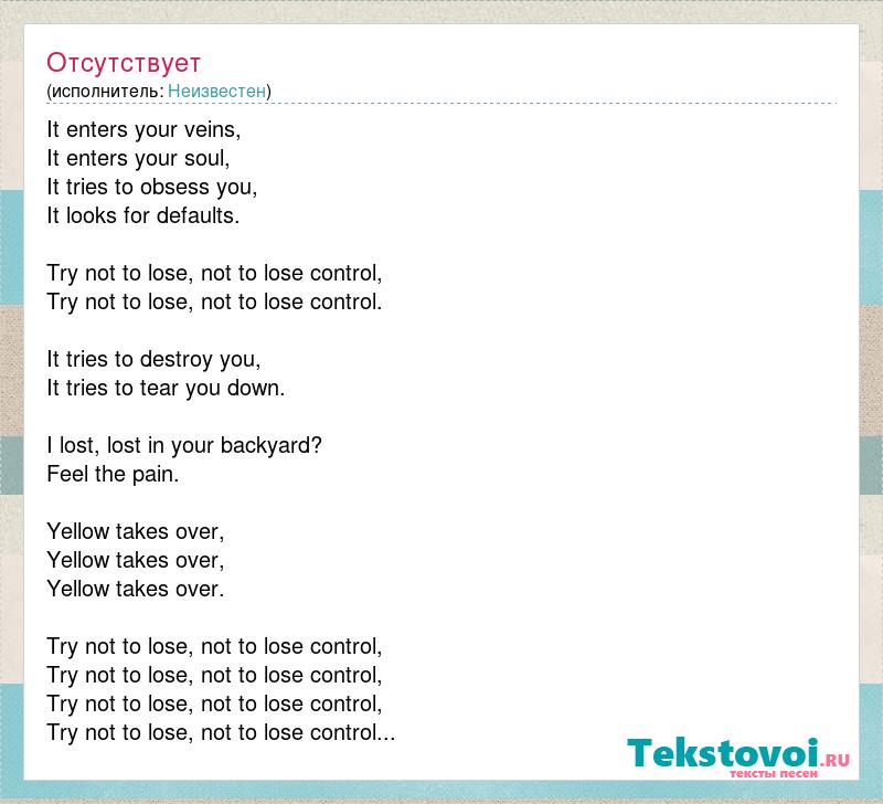 It enters your veins, It enters your soul, It tries to obsess you, It looks for defaults. Try not to lose, not to lose control, Try not to lose, not to lose control. It tries to destroy you, It tries to tear you down. I lost, lost in your backyard? Feel the pain. Yellow takes over, Yellow takes over, Yellow takes over. Try not to lose, not to lose control, Try not to lose, not to lose control, Try not to lose, not to lose control, Try not to lose, not to lose control...
