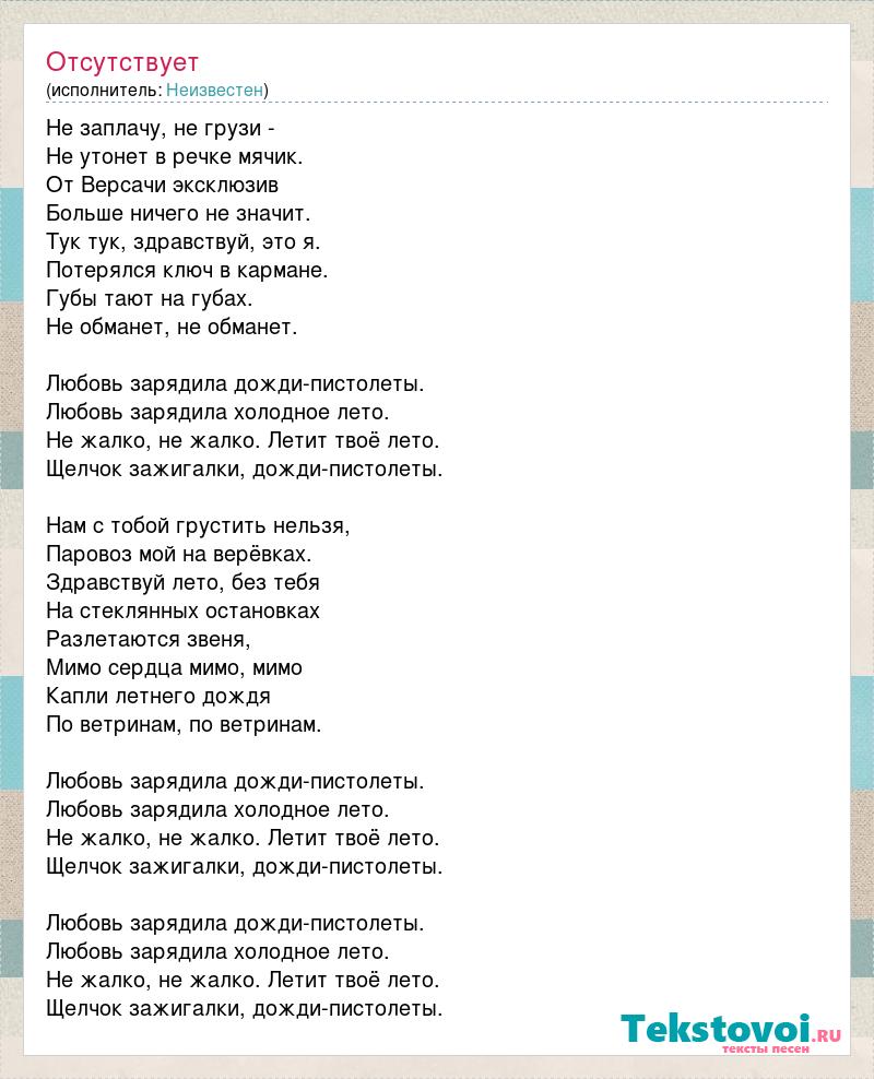 Не заплачу, не грузи - Не утонет в речке мячик. От Версачи эксклюзив Больше ничего не значит. Тук тук, здравствуй, это я. Потерялся ключ в кармане. Губы тают на губах. Не обманет, не обманет. Любовь зарядила дожди-пистолеты. Любовь зарядила холодное лето. Не жалко, не жалко. Летит твоё лето. Щелчок зажигалки, дожди-пистолеты. Нам с тобой грустить нельзя, Паровоз мой на верёвках. Здравствуй лето, без тебя На стеклянных остановках Разлетаются звеня, Мимо сердца мимо, мимо Капли летнего дождя По ветринам, по ветринам. Любовь зарядила дожди-пистолеты. Любовь зарядила холодное лето. Не жалко, не жалко. Летит твоё лето. Щелчок зажигалки, дожди-пистолеты. Любовь зарядила дожди-пистолеты. Любовь зарядила холодное лето. Не жалко, не жалко. Летит твоё лето. Щелчок зажигалки, дожди-пистолеты.