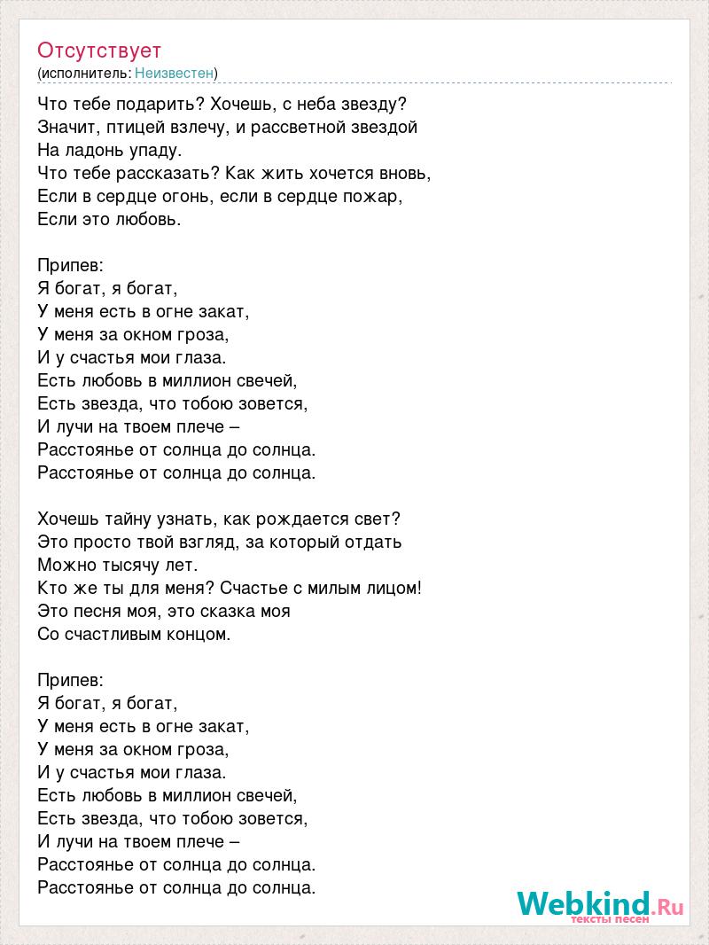 Что тебе подарить? Хочешь, с неба звезду? Значит, птицей взлечу, и рассветной звездой На ладонь упаду. Что тебе рассказать? Как жить хочется вновь, Если в сердце огонь, если в сердце пожар, Если это любовь. Припев: Я богат, я богат, У меня есть в огне закат, У меня за окном гроза, И у счастья мои глаза. Есть любовь в миллион свечей, Есть звезда, что тобою зовется, И лучи на твоем плече – Расстоянье от солнца до солнца. Расстоянье от солнца до солнца. Хочешь тайну узнать, как рождается свет? Это просто твой взгляд, за который отдать Можно тысячу лет. Кто же ты для меня? Счастье с милым лицом! Это песня моя, это сказка моя Со счастливым концом. Припев: Я богат, я богат, У меня есть в огне закат, У меня за окном гроза, И у счастья мои глаза. Есть любовь в миллион свечей, Есть звезда, что тобою зовется, И лучи на твоем плече – Расстоянье от солнца до солнца. Расстоянье от солнца до солнца.