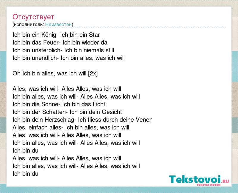 Ich bin ein König- Ich bin ein Star Ich bin das Feuer- Ich bin wieder da Ich bin unsterblich- Ich bin niemals still Ich bin unendlich- Ich bin alles, was ich will Oh Ich bin alles, was ich will [2x] Alles, was ich will- Alles Alles, was ich will Ich bin alles, was ich will- Alles Alles, was ich will Ich bin die Sonne- Ich bin das Licht Ich bin der Schatten- Ich bin dein Gesicht Ich bin dein Herzschlag- Ich fliess durch deine Venen Alles, einfach alles- Ich bin alles, was ich will Alles, was ich will- Alles Alles, was ich will Ich bin alles, was ich will- Alles Alles, was ich will Ich bin du Alles, was ich will- Alles Alles, was ich will Ich bin alles, was ich will- Alles Alles, was ich will Ich bin du