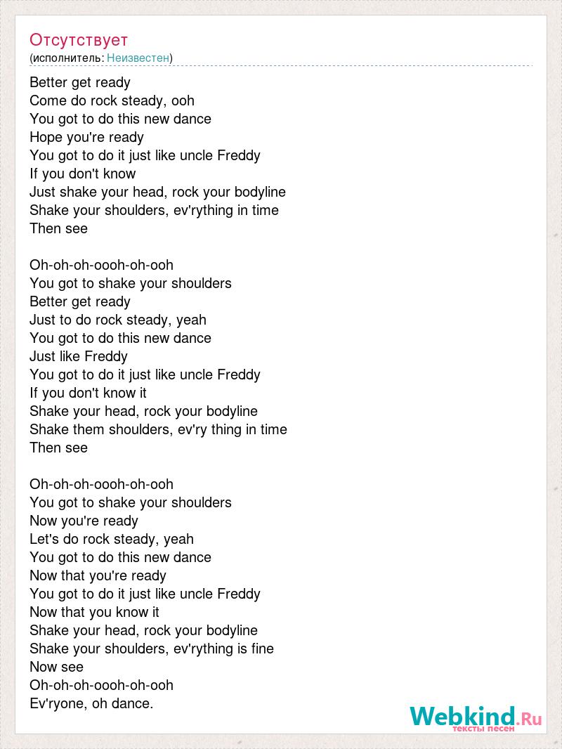 Better get ready [bad word] do rock steady, ooh You got to do this new dance Hope you're ready You got to do it just like uncle Freddy If you don't know Just shake your head, rock your bodyline Shake your shoulders, ev'rything in time Then see Oh-oh-oh-oooh-oh-ooh You got to shake your shoulders Better get ready Just to do rock steady, yeah You got to do this new dance Just like Freddy You got to do it just like uncle Freddy If you don't know it Shake your head, rock your bodyline Shake them shoulders, ev'ry thing in time Then see Oh-oh-oh-oooh-oh-ooh You got to shake your shoulders Now you're ready Let's do rock steady, yeah You got to do this new dance Now that you're ready You got to do it just like uncle Freddy Now that you know it Shake your head, rock your bodyline Shake your shoulders, ev'rything is fine Now see Oh-oh-oh-oooh-oh-ooh Ev'ryone, oh dance.