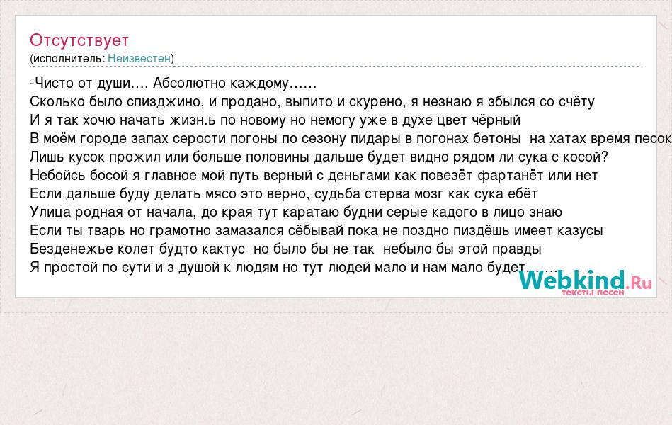 -Чисто от души…. Абсолютно каждому…… Сколько было спизджино, и продано, выпито и скурено, я незнаю я збылся со счёту И я так хочю начать жизн.ь по новому но немогу уже в духе цвет чёрный В моём городе запах серости погоны по сезону пидары в погонах бетоны на хатах время песок Лишь кусок прожил или больше половины дальше будет видно рядом ли сука с косой? Небойсь босой я главное мой путь верный с деньгами как повезёт фартанёт или нет Если дальше буду делать мясо это верно, судьба стерва мозг как сука ебёт Улица родная от начала, до края тут каратаю будни серые кадого в лицо знаю Если ты тварь но грамотно замазался сёбывай пока не поздно пиздёшь имеет казусы Безденежье колет будто кактус но было бы не так небыло бы этой правды Я простой по сути и з душой к людям но тут людей мало и нам мало будет……..