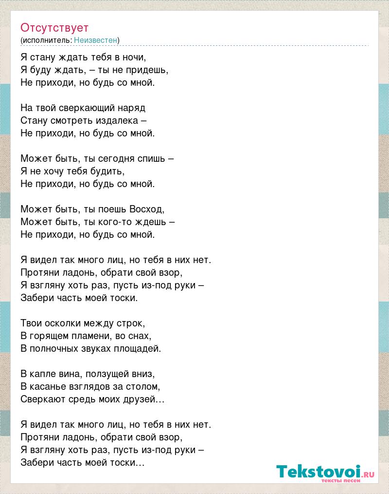 Я стану ждать тебя в ночи, Я буду ждать, – ты не придешь, Не приходи, но будь со мной. На твой сверкающий наряд Стану смотреть издалека – Не приходи, но будь со мной. Может быть, ты сегодня спишь – Я не хочу тебя будить, Не приходи, но будь со мной. Может быть, ты поешь Восход, Может быть, ты кого-то ждешь – Не приходи, но будь со мной. Я видел так много лиц, но тебя в них нет. Протяни ладонь, обрати свой взор, Я взгляну хоть раз, пусть из-под руки – Забери часть моей тоски. Твои осколки между строк, В горящем пламени, во снах, В полночных звуках площадей. В капле вина, ползущей вниз, В касанье взглядов за столом, Сверкают средь моих друзей… Я видел так много лиц, но тебя в них нет. Протяни ладонь, обрати свой взор, Я взгляну хоть раз, пусть из-под руки – Забери часть моей тоски…