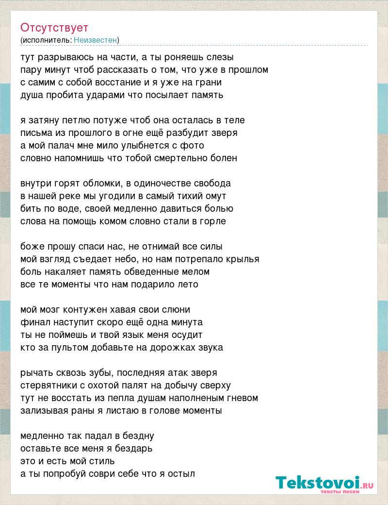 тут разрываюсь на части, а ты роняешь слезы пару минут чтоб рассказать о том, что уже в прошлом с самим с собой восстание и я уже на грани душа пробита ударами что посылает память я затяну петлю потуже чтоб она осталась в теле письма из прошлого в огне ещё разбудит зверя а мой палач мне мило улыбнется с фото словно напомнишь что тобой смертельно болен внутри горят обломки, в одиночестве свобода в нашей реке мы угодили в самый тихий омут бить по воде, своей медленно давиться болью слова на помощь комом словно стали в горле боже прошу спаси нас, не отнимай все силы мой взгляд съедает небо, но нам потрепало крылья боль накаляет память обведенные мелом все те моменты что нам подарило лето мой мозг контужен хавая свои слюни финал наступит скоро ещё одна минута ты не поймешь и твой язык меня осудит кто за пультом добавьте на дорожках звука рычать сквозь зубы, последняя атак зверя стервятники с охотой палят на добычу сверху тут не восстать из пепла душам наполненым гневом зализывая раны я листаю в голове моменты медленно так падал в бездну оставьте все меня я бездарь это и есть мой стиль а ты попробуй соври себе что я остыл