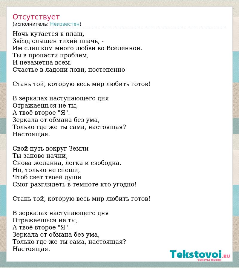 Ночь кутается в плащ, Звёзд слышен тихий плачь, - Им слишком много любви во Вселенной. Ты в пропасти проблем, И незаметна всем. Счастье в ладони лови, постепенно Стань той, которую весь мир любить готов! В зеркалах наступающего дня Отражаешься не ты, А твоё второе "Я". Зеркала от обмана без ума, Только где же ты сама, настоящая? Настоящая. Свой путь вокруг Земли Ты заново начни, Снова желанна, легка и свободна. Но, только не спеши, Чтоб свет твоей души Смог разглядеть в темноте кто угодно! Стань той, которую весь мир любить готов! В зеркалах наступающего дня Отражаешься не ты, А твоё второе "Я". Зеркала от обмана без ума, Только где же ты сама, настоящая? Настоящая.