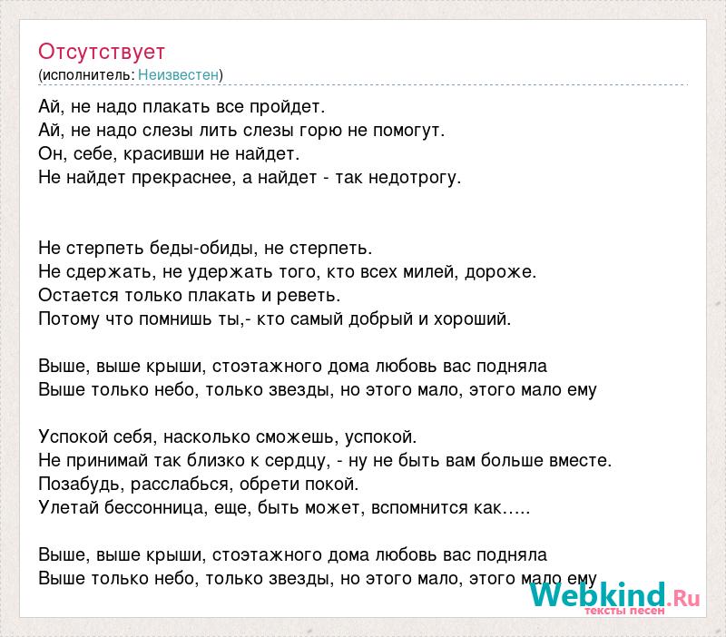 Ай, не надо плакать все пройдет. Ай, не надо слезы лить слезы горю не помогут. Он, себе, красивши не найдет. Не найдет прекраснее, а найдет - так недотрогу. Не стерпеть беды-обиды, не стерпеть. Не сдержать, не удержать того, кто всех милей, дороже. Остается только плакать и реветь. Потому что помнишь ты,- кто самый добрый и хороший. Выше, выше крыши, стоэтажного дома любовь вас подняла Выше только небо, только звезды, но этого мало, этого мало ему Успокой себя, насколько сможешь, успокой. Не принимай так близко к сердцу, - ну не быть вам больше вместе. Позабудь, расслабься, обрети покой. Улетай бессонница, еще, быть может, вспомнится как….. Выше, выше крыши, стоэтажного дома любовь вас подняла Выше только небо, только звезды, но этого мало, этого мало ему