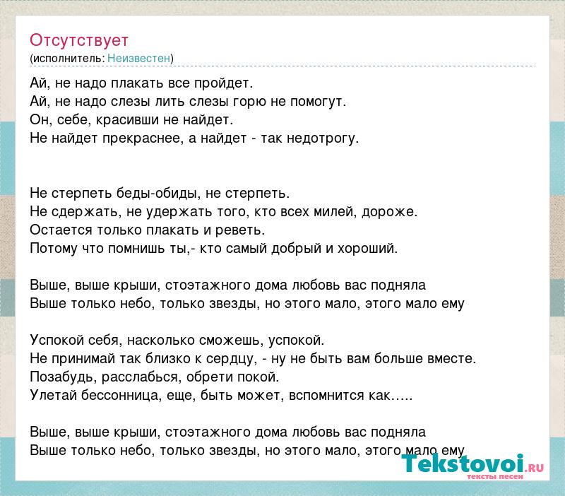Ай, не надо плакать все пройдет. Ай, не надо слезы лить слезы горю не помогут. Он, себе, красивши не найдет. Не найдет прекраснее, а найдет - так недотрогу. Не стерпеть беды-обиды, не стерпеть. Не сдержать, не удержать того, кто всех милей, дороже. Остается только плакать и реветь. Потому что помнишь ты,- кто самый добрый и хороший. Выше, выше крыши, стоэтажного дома любовь вас подняла Выше только небо, только звезды, но этого мало, этого мало ему Успокой себя, насколько сможешь, успокой. Не принимай так близко к сердцу, - ну не быть вам больше вместе. Позабудь, расслабься, обрети покой. Улетай бессонница, еще, быть может, вспомнится как….. Выше, выше крыши, стоэтажного дома любовь вас подняла Выше только небо, только звезды, но этого мало, этого мало ему
