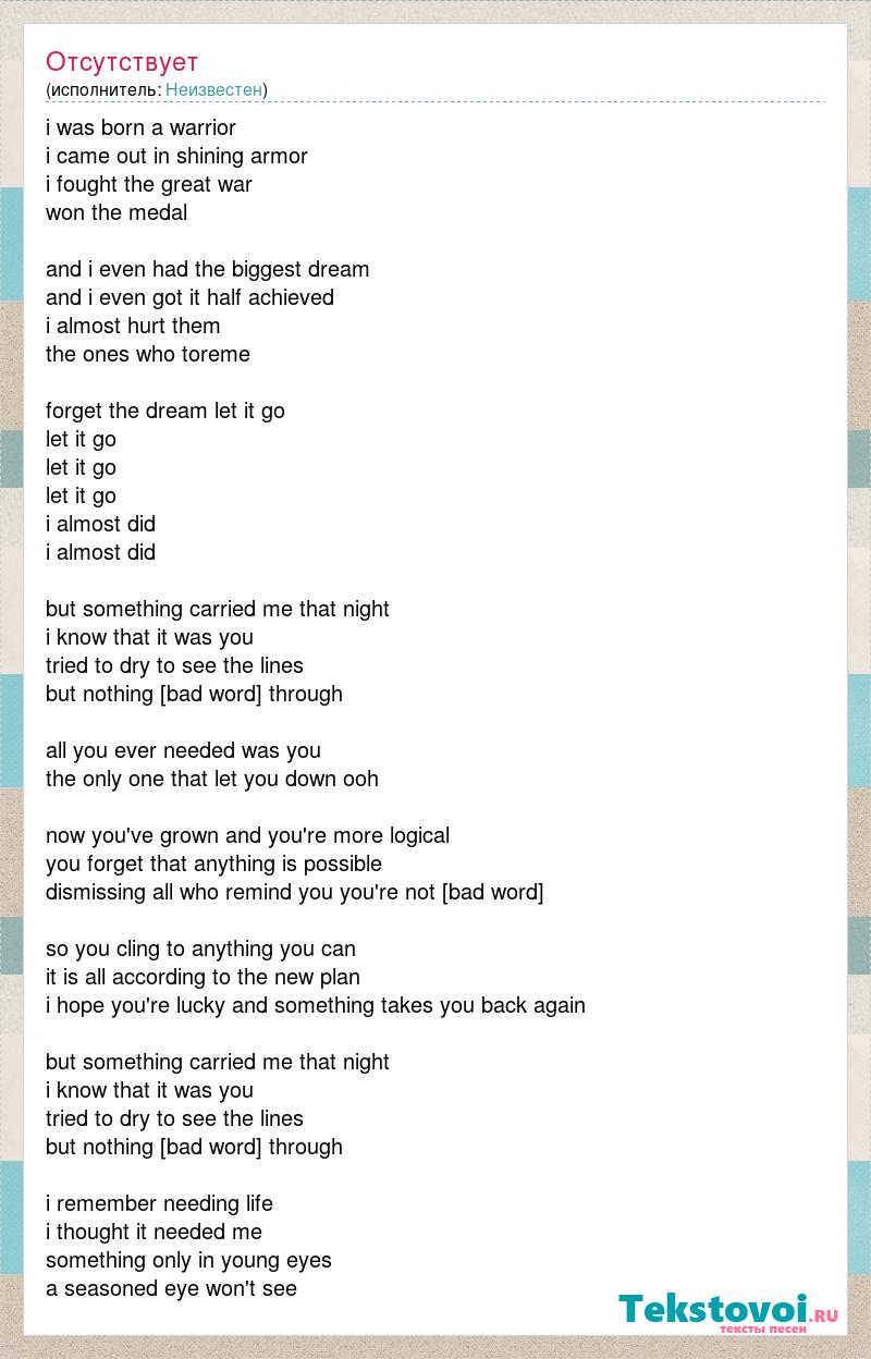 i was born a warrior i came out in shining armor i fought the great war won the medal and i even had the biggest dream and i even got it half achieved i almost hurt them the ones who toreme forget the dream let it go let it go let it go let it go i almost did i almost did but something carried me that night i know that it was you tried to dry to see the lines but nothing [bad word] through all you ever needed was you the only one that let you down ooh now you've grown and you're more logical you forget that anything is possible dismissing all who remind you you're not [bad word] so you cling to anything you can it is all according to the new plan i hope you're lucky and something takes you back again but something carried me that night i know that it was you tried to dry to see the lines but nothing [bad word] through i remember needing life i thought it needed me something only in young eyes a seasoned eye won't see