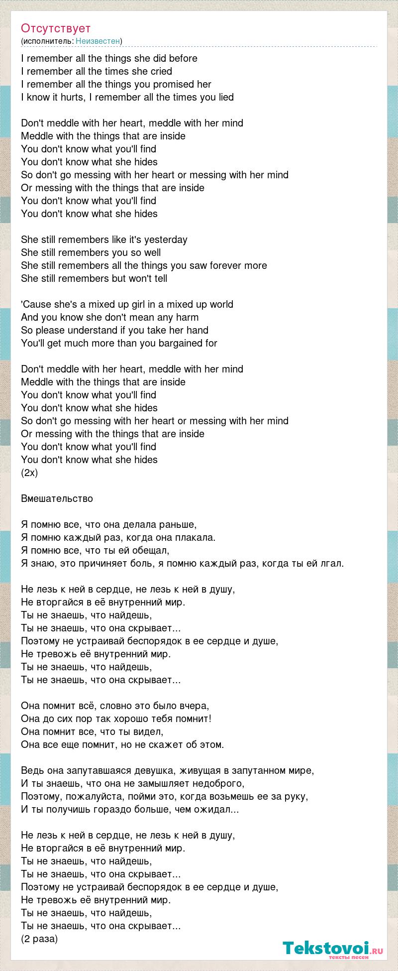 I remember all the things she did before I remember all the times she cried I remember all the things you promised her I know it hurts, I remember all the times you lied Don't meddle with her heart, meddle with her mind Meddle with the things that are inside You don't know what you'll find You don't know what she hides So don't go messing with her heart or messing with her mind Or messing with the things that are inside You don't know what you'll find You don't know what she hides She still remembers like it's yesterday She still remembers you so well She still remembers all the things you saw forever more She still remembers but won't tell 'Cause she's a mixed up girl in a mixed up world And you know she don't mean any harm So please understand if you take her hand You'll get much more than you bargained for Don't meddle with her heart, meddle with her mind Meddle with the things that are inside You don't know what you'll find You don't know what she hides So don't go messing with her heart or messing with her mind Or messing with the things that are inside You don't know what you'll find You don't know what she hides (2x) Вмешательство Я помню все, что она делала раньше, Я помню каждый раз, когда она плакала. Я помню все, что ты ей обещал, Я знаю, это причиняет боль, я помню каждый раз, когда ты ей лгал. Не лезь к ней в сердце, не лезь к ней в душу, Не вторгайся в её внутренний мир. Ты не знаешь, что найдешь, Ты не знаешь, что она скрывает... Поэтому не устраивай беспорядок в ее сердце и душе, Не тревожь её внутренний мир. Ты не знаешь, что найдешь, Ты не знаешь, что она скрывает... Она помнит всё, словно это было вчера, Она до сих пор так хорошо тебя помнит! Она помнит все, что ты видел, Она все еще помнит, но не скажет об этом. Ведь она запутавшаяся девушка, живущая в запутанном мире, И ты знаешь, что она не замышляет недоброго, Поэтому, пожалуйста, пойми это, когда возьмешь ее за руку, И ты получишь гораздо больше, чем ожидал... Не лезь к ней в сердце, не лезь к ней в душу, Не вторгайся в её внутренний мир. Ты не знаешь, что найдешь, Ты не знаешь, что она скрывает... Поэтому не устраивай беспорядок в ее сердце и душе, Не тревожь её внутренний мир. Ты не знаешь, что найдешь, Ты не знаешь, что она скрывает... (2 раза)