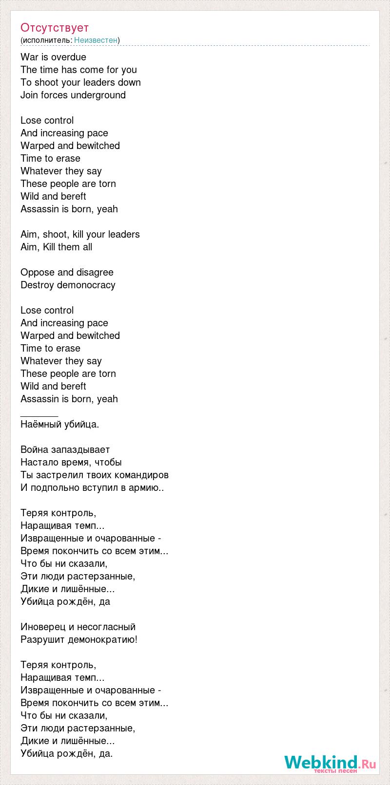 War is overdue The time [bad word] for you To shoot your leaders down Join forces underground Lose control And increasing pace Warped and bewitched Time to erase Whatever they say These people are torn Wild and bereft Assassin is born, yeah Aim, shoot, kill your leaders Aim, Kill them all Oppose and disagree Destroy demonocracy Lose control And increasing pace Warped and bewitched Time to erase Whatever they say These people are torn Wild and bereft Assassin is born, yeah _______ Наёмный убийца. Война запаздывает Настало время, чтобы Ты застрелил твоих командиров И подпольно вступил в армию.. Теряя контроль, Наращивая темп... Извращенные и очарованные - Время покончить со всем этим... Что бы ни сказали, Эти люди растерзанные, Дикие и лишённые... Убийца рождён, да Иноверец и несогласный Разрушит демонократию! Теряя контроль, Наращивая темп... Извращенные и очарованные - Время покончить со всем этим... Что бы ни сказали, Эти люди растерзанные, Дикие и лишённые... Убийца рождён, да.