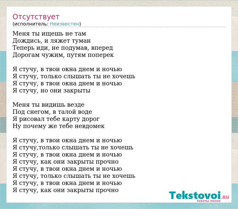 Меня ты ищешь не там Дождись, и ляжет туман Теперь иди, не подумав, вперед Дорогам чужим, путям поперек Я стучу, в твои окна днем и ночью Я стучу, только слышать ты не хочешь Я стучу, в твои окна днем и ночью Я стучу, но они закрыты Меня ты видишь везде Под снегом, в талой воде Я рисовал тебе карту дорог Ну почему же тебе невдомек Я стучу, в твои окна днем и ночью Я стучу,только слышать ты не хочешь Я стучу, в твои окна днем и ночью Я стучу, как они закрыты прочно Я стучу, в твои окна днем и ночью Я стучу, только слышать ты не хочешь Я стучу, в твои окна днем и ночью Я стучу, как они закрыты прочно