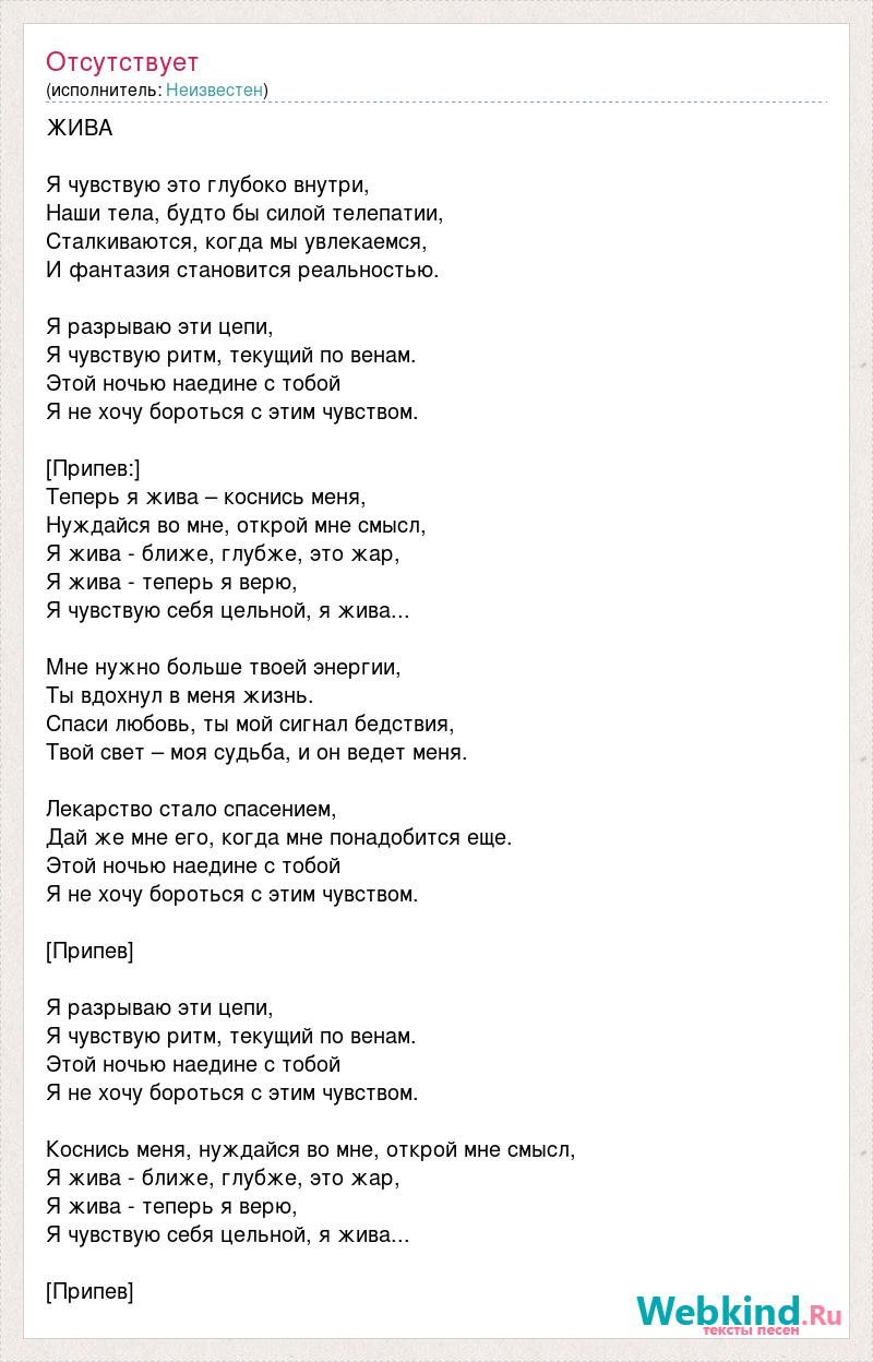 ЖИВА Я чувствую это глубоко внутри, Наши тела, будто бы силой телепатии, Сталкиваются, когда мы увлекаемся, И фантазия становится реальностью. Я разрываю эти цепи, Я чувствую ритм, текущий по венам. Этой ночью наедине с тобой Я не хочу бороться с этим чувством. [Припев:] Теперь я жива – коснись меня, Нуждайся во мне, открой мне смысл, Я жива - ближе, глубже, это жар, Я жива - теперь я верю, Я чувствую себя цельной, я жива... Мне нужно больше твоей энергии, Ты вдохнул в меня жизнь. Спаси любовь, ты мой сигнал бедствия, Твой свет – моя судьба, и он ведет меня. Лекарство стало спасением, Дай же мне его, когда мне понадобится еще. Этой ночью наедине с тобой Я не хочу бороться с этим чувством. [Припев] Я разрываю эти цепи, Я чувствую ритм, текущий по венам. Этой ночью наедине с тобой Я не хочу бороться с этим чувством. Коснись меня, нуждайся во мне, открой мне смысл, Я жива - ближе, глубже, это жар, Я жива - теперь я верю, Я чувствую себя цельной, я жива... [Припев]