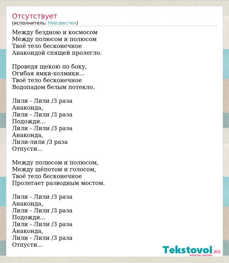 Между бездною и космосом Между полюсом и полюсом Твоё тело бесконечное Анакондой спящей пролегло. Проведя щекою по боку, Огибая ямки-холмики... Твоё тело бесконечное Водопадом белым потекло. Лили - Лили /3 раза Анаконда, Лили - Лили /3 раза Подожди... Лили - Лили /3 раза Анаконда, Лили-лили /3 раза Отпусти... Между полюсом и полюсом, Между шёпотом и голосом, Твоё тело бесконечное Пролегает разводным мостом. Лили - Лили /3 раза Анаконда, Лили - Лили /3 раза Подожди... Лили - Лили /3 раза Анаконда, Лили - Лили /3 раза Отпусти...