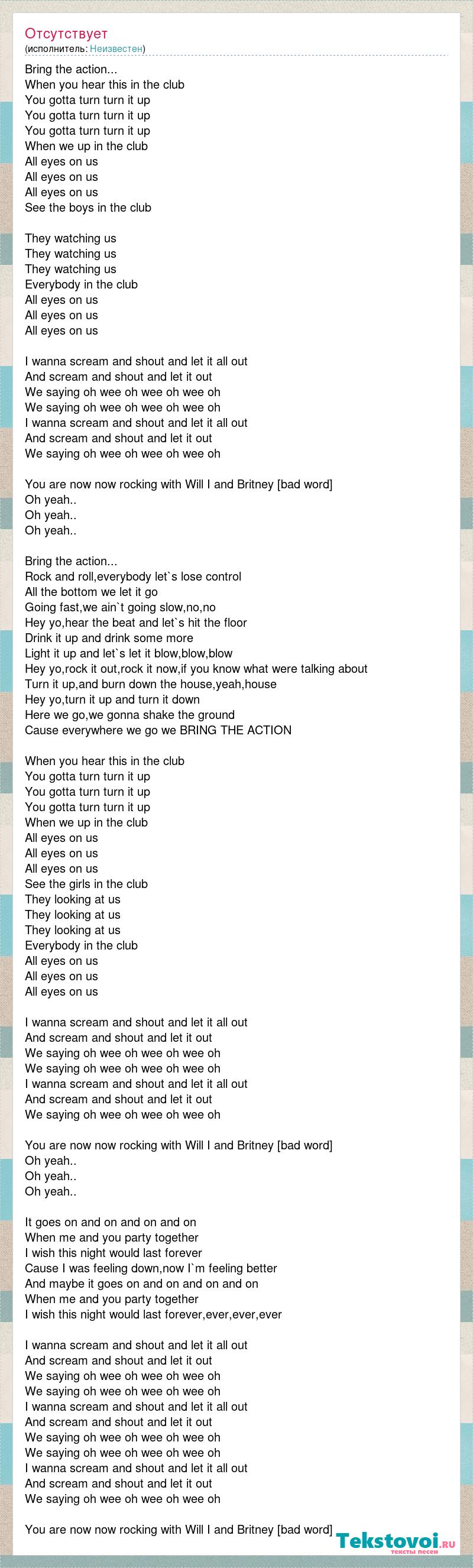 Bring the action... When you hear this in the club You gotta turn turn it up You gotta turn turn it up You gotta turn turn it up When we up in the club All eyes on us All eyes on us All eyes on us See the boys in the club They watching us They watching us They watching us Everybody in the club All eyes on us All eyes on us All eyes on us I wanna scream and shout and let it all out And scream and shout and let it out We saying oh wee oh wee oh wee oh We saying oh wee oh wee oh wee oh I wanna scream and shout and let it all out And scream and shout and let it out We saying oh wee oh wee oh wee oh You are now now rocking with Will I and Britney [bad word] Oh yeah.. Oh yeah.. Oh yeah.. Bring the action... Rock and roll,everybody let`s lose control All the bottom we let it go Going fast,we ain`t going slow,no,no Hey yo,hear the beat and let`s hit the floor Drink it up and drink some more Light it up and let`s let it blow,blow,blow Hey yo,rock it out,rock it now,if you know what were talking about Turn it up,and burn down the house,yeah,house Hey yo,turn it up and turn it down Here we go,we gonna shake the ground Cause everywhere we go we BRING THE ACTION When you hear this in the club You gotta turn turn it up You gotta turn turn it up You gotta turn turn it up When we up in the club All eyes on us All eyes on us All eyes on us See the girls in the club They looking at us They looking at us They looking at us Everybody in the club All eyes on us All eyes on us All eyes on us I wanna scream and shout and let it all out And scream and shout and let it out We saying oh wee oh wee oh wee oh We saying oh wee oh wee oh wee oh I wanna scream and shout and let it all out And scream and shout and let it out We saying oh wee oh wee oh wee oh You are now now rocking with Will I and Britney [bad word] Oh yeah.. Oh yeah.. Oh yeah.. It goes on and on and on and on When me and you party together I wish this night would last forever Cause I was feeling down,now I`m feeling better And maybe it goes on and on and on and on When me and you party together I wish this night would last forever,ever,ever,ever I wanna scream and shout and let it all out And scream and shout and let it out We saying oh wee oh wee oh wee oh We saying oh wee oh wee oh wee oh I wanna scream and shout and let it all out And scream and shout and let it out We saying oh wee oh wee oh wee oh We saying oh wee oh wee oh wee oh I wanna scream and shout and let it all out And scream and shout and let it out We saying oh wee oh wee oh wee oh You are now now rocking with Will I and Britney [bad word]