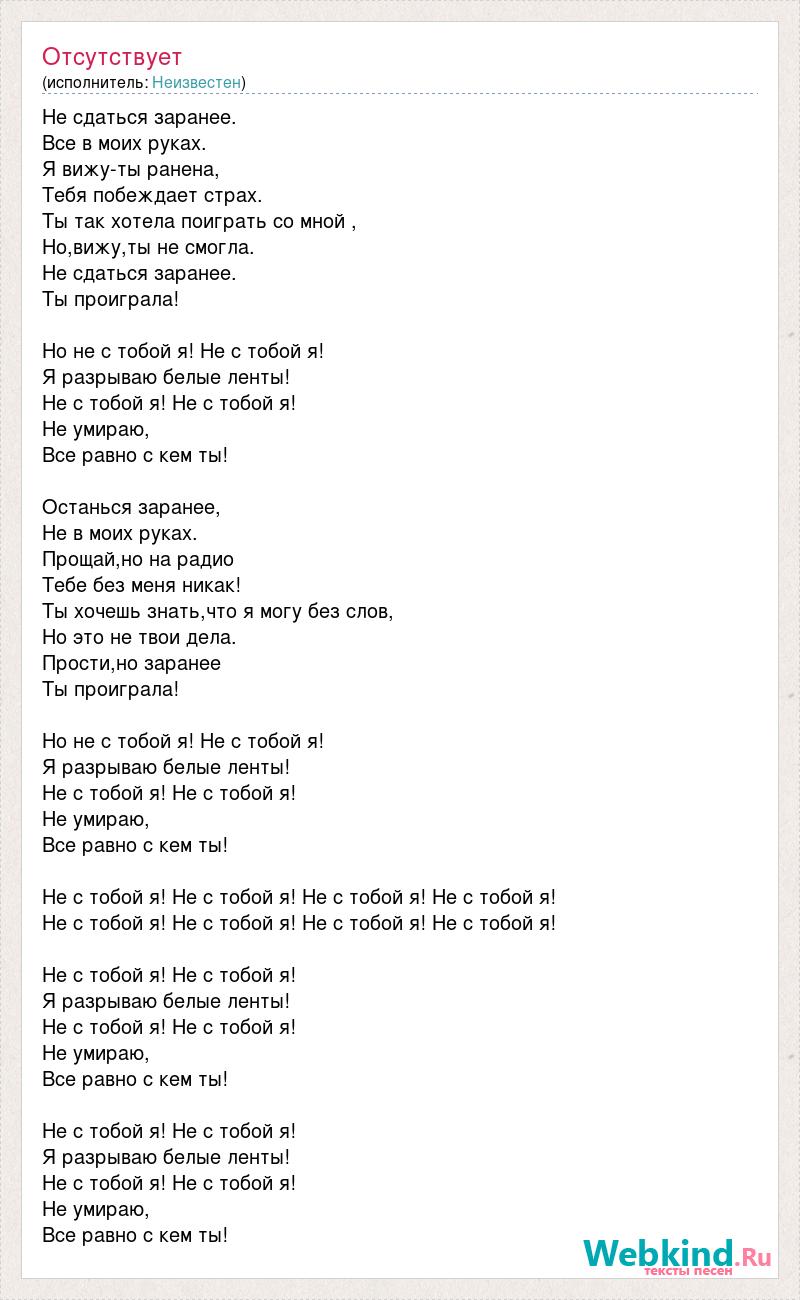 Не сдаться заранее. Все в моих руках. Я вижу-ты ранена, Тебя побеждает страх. Ты так хотела поиграть со мной , Но,вижу,ты не смогла. Не сдаться заранее. Ты проиграла! Но не с тобой я! Не с тобой я! Я разрываю белые ленты! Не с тобой я! Не с тобой я! Не умираю, Все равно с кем ты! Останься заранее, Не в моих руках. Прощай,но на радио Тебе без меня никак! Ты хочешь знать,что я могу без слов, Но это не твои дела. Прости,но заранее Ты проиграла! Но не с тобой я! Не с тобой я! Я разрываю белые ленты! Не с тобой я! Не с тобой я! Не умираю, Все равно с кем ты! Не с тобой я! Не с тобой я! Не с тобой я! Не с тобой я! Не с тобой я! Не с тобой я! Не с тобой я! Не с тобой я! Не с тобой я! Не с тобой я! Я разрываю белые ленты! Не с тобой я! Не с тобой я! Не умираю, Все равно с кем ты! Не с тобой я! Не с тобой я! Я разрываю белые ленты! Не с тобой я! Не с тобой я! Не умираю, Все равно с кем ты!