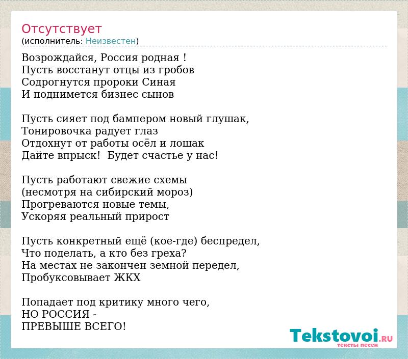 Возрождайся, Россия родная ! Пусть восстанут отцы из гробов Содрогнутся пророки Синая И поднимется бизнес сынов Пусть сияет под бампером новый глушак, Тонировочка радует глаз Отдохнут от работы осёл и лошак Дайте впрыск! Будет счастье у нас! Пусть работают свежие схемы (несмотря на сибирский мороз) Прогреваются новые темы, Ускоряя реальный прирост Пусть конкретный ещё (кое-где) беспредел, Что поделать, а кто без греха? На местах не закончен земной передел, Пробуксовывает ЖКХ Попадает под критику много чего, НО РОССИЯ - ПРЕВЫШЕ ВСЕГО!