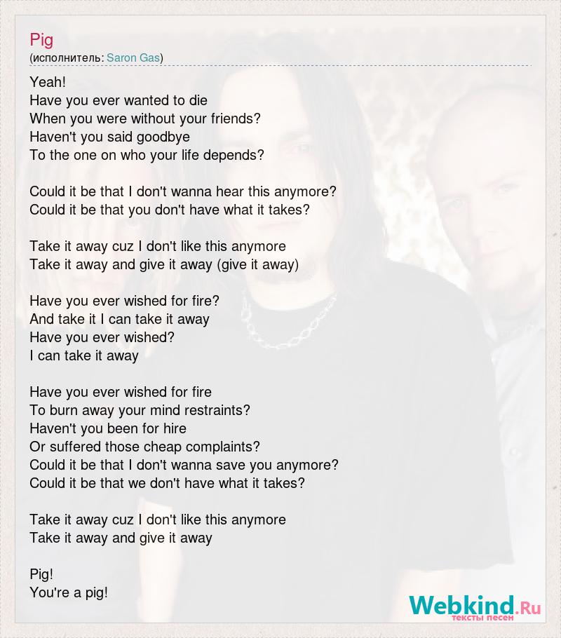 Yeah! Have you ever wanted to die When you were without your friends? Haven't you said goodbye To the one on who your life depends? Could it be that I don't wanna hear this anymore? Could it be that you don't have what it takes? Take it away cuz I don't like this anymore Take it away and give it away (give it away) Have you ever wished for fire? And take it I can take it away Have you ever wished? I can take it away Have you ever wished for fire To burn away your mind restraints? Haven't you been for hire Or suffered those [bad word] Could it be that I don't wanna save you anymore? Could it be that we don't have what it takes? Take it away cuz I don't like this anymore Take it away and give it away Pig! You're a pig!