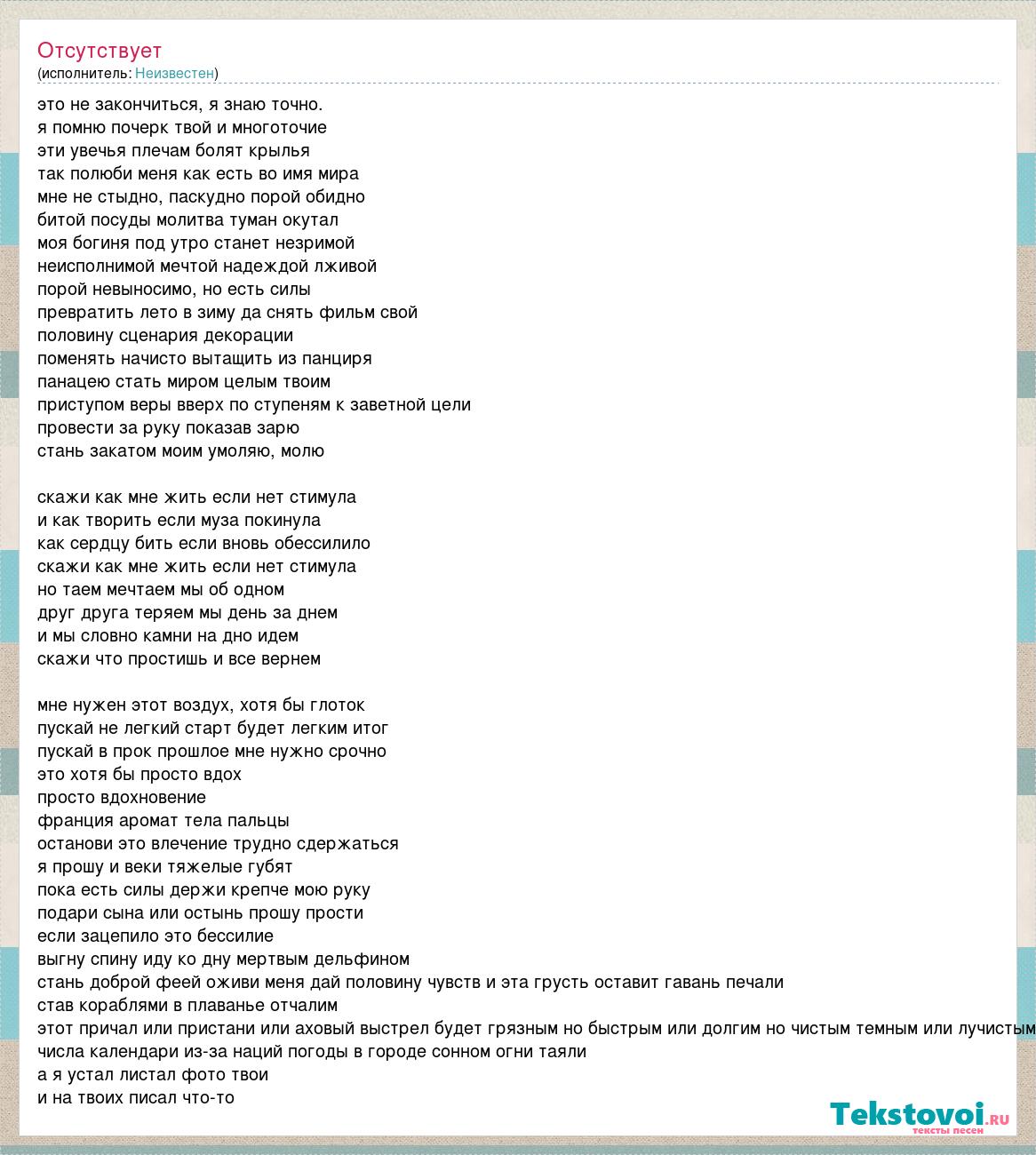 это не закончиться, я знаю точно. я помню почерк твой и многоточие эти увечья плечам болят крылья так полюби меня как есть во имя мира мне не стыдно, паскудно порой обидно битой посуды молитва туман окутал моя богиня под утро станет незримой неисполнимой мечтой надеждой лживой порой невыносимо, но есть силы превратить лето в зиму да снять фильм свой половину сценария декорации поменять начисто вытащить из панциря панацею стать миром целым твоим приступом веры вверх по ступеням к заветной цели провести за руку показав зарю стань закатом моим умоляю, молю скажи как мне жить если нет стимула и как творить если муза покинула как сердцу бить если вновь обессилило скажи как мне жить если нет стимула но таем мечтаем мы об одном друг друга теряем мы день за днем и мы словно камни на дно идем скажи что простишь и все вернем мне нужен этот воздух, хотя бы глоток пускай не легкий старт будет легким итог пускай в прок прошлое мне нужно срочно это хотя бы просто вдох просто вдохновение франция аромат тела пальцы останови это влечение трудно сдержаться я прошу и веки тяжелые губят пока есть силы держи крепче мою руку подари сына или остынь прошу прости если зацепило это бессилие выгну спину иду ко дну мертвым дельфином стань доброй феей оживи меня дай половину чувств и эта грусть оставит гавань печали став кораблями в плаванье отчалим этот причал или пристани или аховый выстрел будет грязным но быстрым или долгим но чистым темным или лучистым числа календари из-за наций погоды в городе сонном огни таяли а я устал листал фото твои и на твоих писал что-то