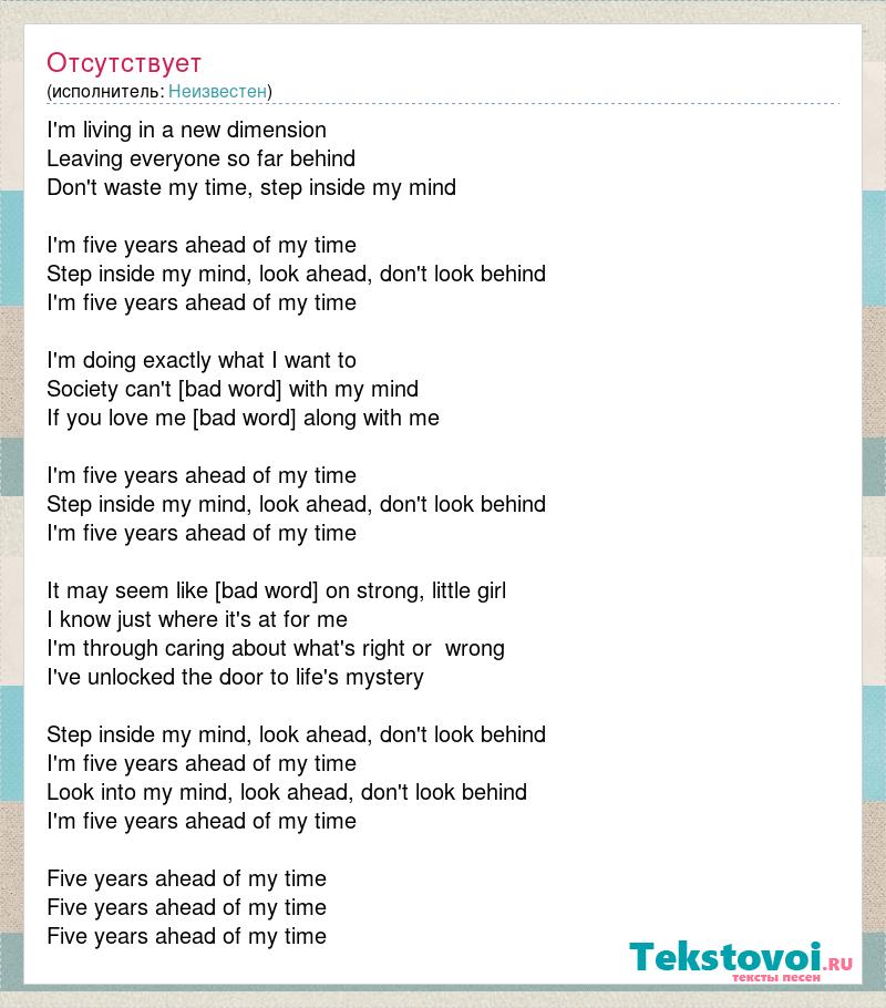 I'm living in a new dimension Leaving everyone so far behind Don't waste my time, step inside my mind I'm five years ahead of my time Step inside my mind, look ahead, don't look behind I'm five years ahead of my time I'm doing exactly what I want to Society can't [bad word] with my mind If you love me [bad word] along with me I'm five years ahead of my time Step inside my mind, look ahead, don't look behind I'm five years ahead of my time It may seem like [bad word] on strong, little girl I know just where it's at for me I'm through caring about what's right or wrong I've unlocked the door to life's mystery Step inside my mind, look ahead, don't look behind I'm five years ahead of my time Look into my mind, look ahead, don't look behind I'm five years ahead of my time Five years ahead of my time Five years ahead of my time Five years ahead of my time