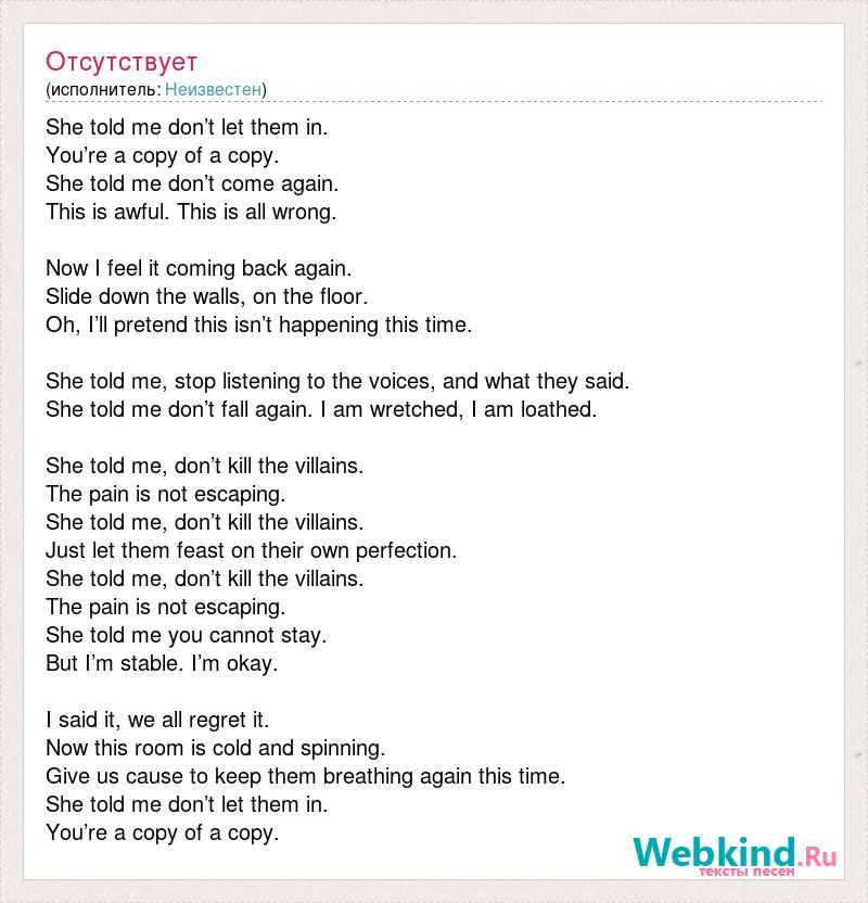 She told me don’t let them in. You’re a copy of a copy. She told me [bad word] again. This is awful. This is all wrong. Now I feel [bad word] back again. Slide down the walls, on the floor. Oh, I’ll pretend this isn’t happening this time. She told me, stop listening to the voices, and what they said. She told me don’t fall again. I am wretched, I am loathed. She told me, don’t kill the villains. The pain is not escaping. She told me, don’t kill the villains. Just let them feast on their own perfection. She told me, don’t kill the villains. The pain is not escaping. She told me you cannot stay. But I’m stable. I’m okay. I said it, we all regret it. Now this room is cold and spinning. Give us cause to keep them breathing again this time. She told me don’t let them in. You’re a copy of a copy.