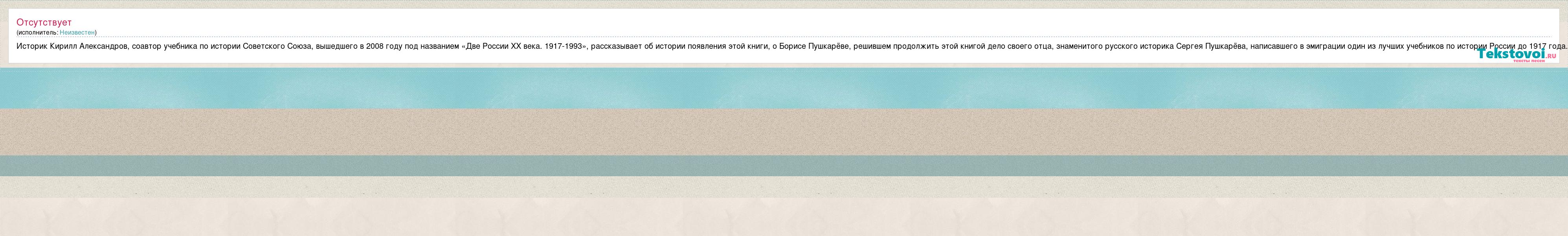 Историк Кирилл Александров, соавтор учебника по истории Советского Союза, вышедшего в 2008 году под названием «Две России XX века. 1917-1993», рассказывает об истории появления этой книги, о Борисе Пушкарёве, решившем продолжить этой книгой дело своего отца, знаменитого русского историка Сергея Пушкарёва, написавшего в эмиграции один из лучших учебников по истории России до 1917 года.