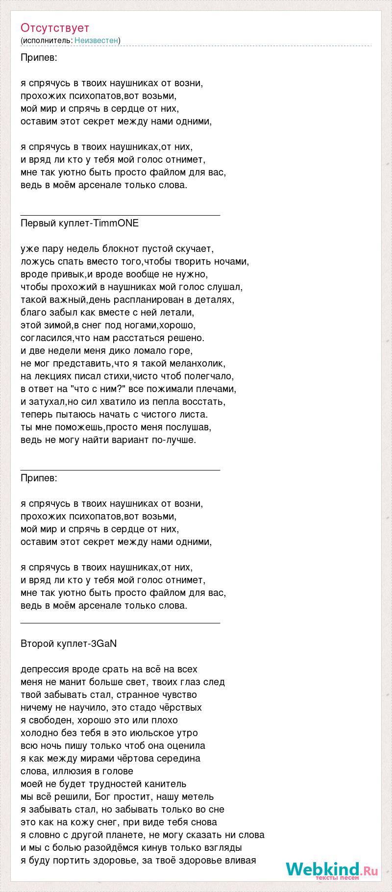 Припев: я спрячусь в твоих наушниках от возни, прохожих психопатов,вот возьми, мой мир и спрячь в сердце от них, оставим этот секрет между нами одними, я спрячусь в твоих наушниках,от них, и вряд ли кто у тебя мой голос отнимет, мне так уютно быть просто файлом для вас, ведь в моём арсенале только слова. _____________________________________ Первый куплет-TimmONE уже пару недель блокнот пустой скучает, ложусь спать вместо того,чтобы творить ночами, вроде привык,и вроде вообще не нужно, чтобы прохожий в наушниках мой голос слушал, такой важный,день распланирован в деталях, благо забыл как вместе с ней летали, этой зимой,в снег под ногами,хорошо, согласился,что нам расстаться решено. и две недели меня дико ломало горе, не мог представить,что я такой меланхолик, на лекциях писал стихи,чисто чтоб полегчало, в ответ на "что с ним?" все пожимали плечами, и затухал,но сил хватило из пепла восстать, теперь пытаюсь начать с чистого листа. ты мне поможешь,просто меня послушав, ведь не могу найти вариант по-лучше. _____________________________________ Припев: я спрячусь в твоих наушниках от возни, прохожих психопатов,вот возьми, мой мир и спрячь в сердце от них, оставим этот секрет между нами одними, я спрячусь в твоих наушниках,от них, и вряд ли кто у тебя мой голос отнимет, мне так уютно быть просто файлом для вас, ведь в моём арсенале только слова. _____________________________________ Второй куплет-3GaN депрессия вроде срать на всё на всех меня не манит больше свет, твоих глаз след твой забывать стал, странное чувство ничему не научило, это стадо чёрствых я свободен, хорошо это или плохо холодно без тебя в это июльское утро всю ночь пишу только чтоб она оценила я как между мирами чёртова середина слова, иллюзия в голове моей не будет трудностей канитель мы всё решили, Бог простит, нашу метель я забывать стал, но забывать только во сне это как на кожу снег, при виде тебя снова я словно с другой планете, не могу сказать ни слова и мы с болью разойдёмся кинув только взгляды я буду портить здоровье, за твоё здоровье вливая