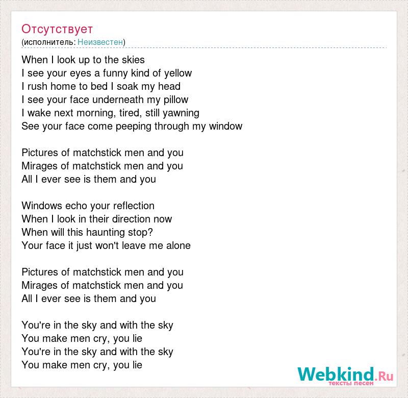 When I look up to the skies I see your eyes a funny kind of yellow [bad word] home to bed I soak my head I see your face underneath my pillow I wake next morning, tired, still yawning See your [bad word] peeping through my window Pictures of matchstick men and you Mirages of matchstick men and you All I ever see is them and you Windows echo your reflection When I look in their direction now When will this haunting stop? Your face it just won't leave me alone Pictures of matchstick men and you Mirages of matchstick men and you All I ever see is them and you You're in the sky and with the sky You make men cry, you lie You're in the sky and with the sky You make men cry, you lie