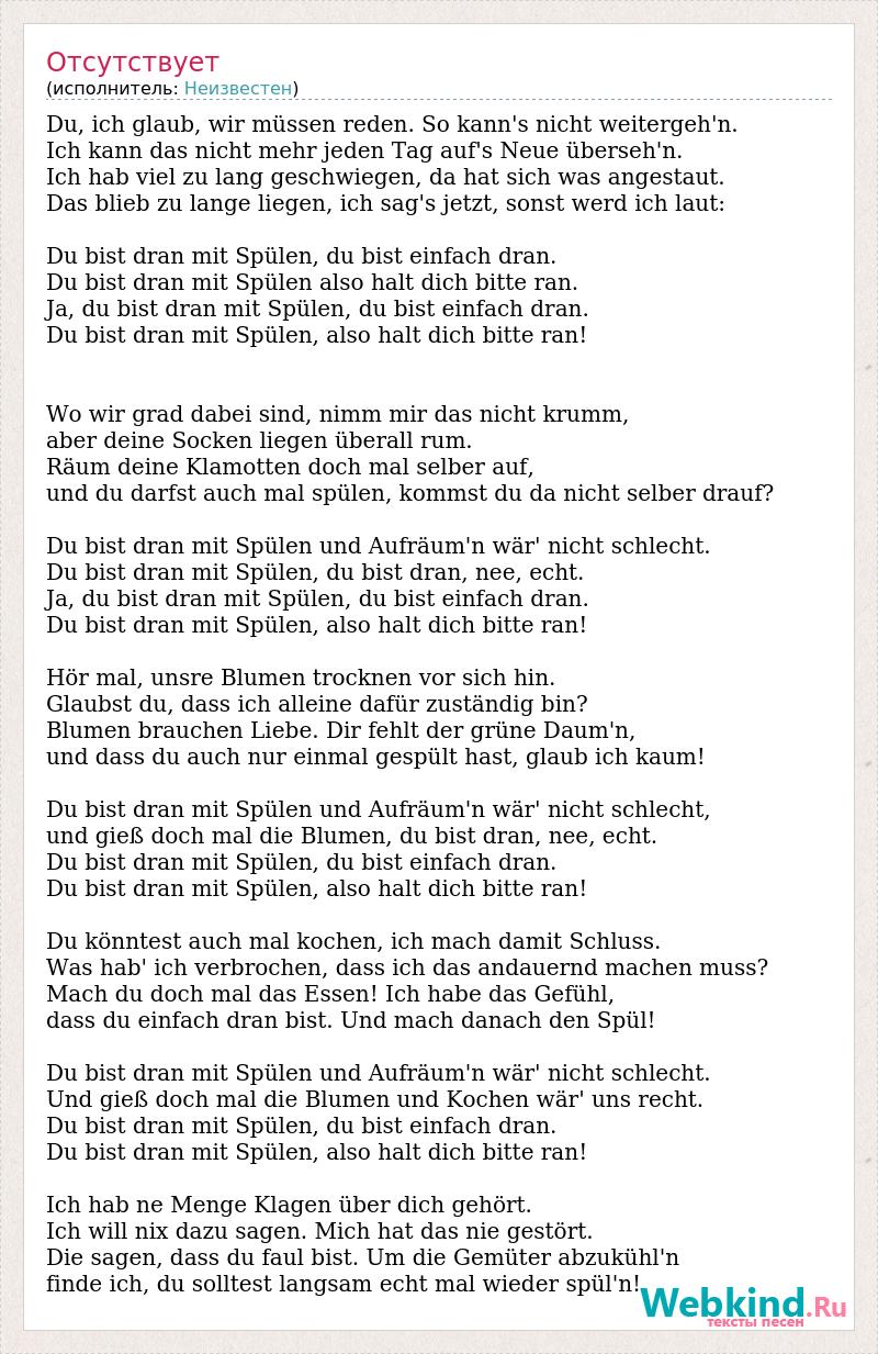 Du, ich glaub, wir müssen reden. So kann's nicht weitergeh'n. Ich kann das nicht mehr jeden Tag auf's Neue überseh'n. Ich hab viel zu lang geschwiegen, da hat sich was angestaut. Das blieb zu lange liegen, ich sag's jetzt, sonst werd ich laut: Du bist dran mit Spülen, du bist einfach dran. Du bist dran mit Spülen also halt dich bitte ran. Ja, du bist dran mit Spülen, du bist einfach dran. Du bist dran mit Spülen, also halt dich bitte ran! Wo wir grad dabei sind, nimm mir das nicht [bad word] aber deine Socken liegen [bad word] Räum deine Klamotten doch mal selber auf, und du darfst auch mal spülen, kommst du da nicht selber drauf? Du bist dran mit Spülen und Aufräum'n wär' nicht schlecht. Du bist dran mit Spülen, du bist dran, nee, echt. Ja, du bist dran mit Spülen, du bist einfach dran. Du bist dran mit Spülen, also halt dich bitte ran! Hör mal, unsre Blumen trocknen vor sich hin. Glaubst du, dass ich alleine dafür zuständig bin? Blumen brauchen Liebe. Dir fehlt der grüne Daum'n, und dass du auch nur einmal gespült hast, glaub ich kaum! Du bist dran mit Spülen und Aufräum'n wär' nicht schlecht, und gieß doch mal die Blumen, du bist dran, nee, echt. Du bist dran mit Spülen, du bist einfach dran. Du bist dran mit Spülen, also halt dich bitte ran! Du könntest auch mal kochen, ich mach damit Schluss. Was hab' ich verbrochen, dass ich das andauernd machen muss? Mach du doch mal das Essen! Ich habe das Gefühl, dass du einfach dran bist. Und mach danach den Spül! Du bist dran mit Spülen und Aufräum'n wär' nicht schlecht. Und gieß doch mal die Blumen und Kochen wär' uns recht. Du bist dran mit Spülen, du bist einfach dran. Du bist dran mit Spülen, also halt dich bitte ran! Ich hab ne Menge Klagen über dich gehört. Ich will nix dazu sagen. Mich hat das nie gestört. Die sagen, dass du faul bist. Um die Gemüter abzukühl'n finde ich, du solltest langsam echt mal wieder spül'n!