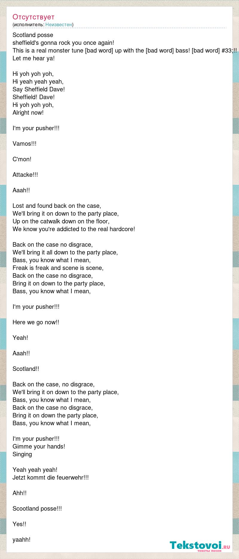 Scotland posse sheffield's gonna rock you once again! This is a real monster tune [bad word] up with the [bad word] bass! [bad word] #33;!! Let me hear ya! Hi yoh yoh yoh, Hi yeah yeah yeah, Say Sheffield Dave! Sheffield! Dave! Hi yoh yoh yoh, Alright now! I'm your pusher!!! Vamos!!! C'mon! Attacke!!! Aaah!! Lost and found back on the case, We'll bring it on down to the party place, Up on the catwalk down on the floor, We know you're addicted to the real hardcore! Back on the case no disgrace, We'll bring it all down to the party place, Bass, you know what I mean, Freak is freak and scene is scene, Back on the case no disgrace, Bring it on down to the party place, Bass, you know what I mean, I'm your pusher!!! Here we go now!! Yeah! Aaah!! Scotland!! Back on the case, no disgrace, We'll bring it on down to the party place, Bass, you know what I mean, Back on the case no disgrace, Bring it on down the party place, Bass, you know what I mean, I'm your pusher!!! Gimme your hands! Singing Yeah yeah yeah! Jetzt kommt die feuerwehr!!! Ahh!! Scootland posse!!! Yes!! yaahh!