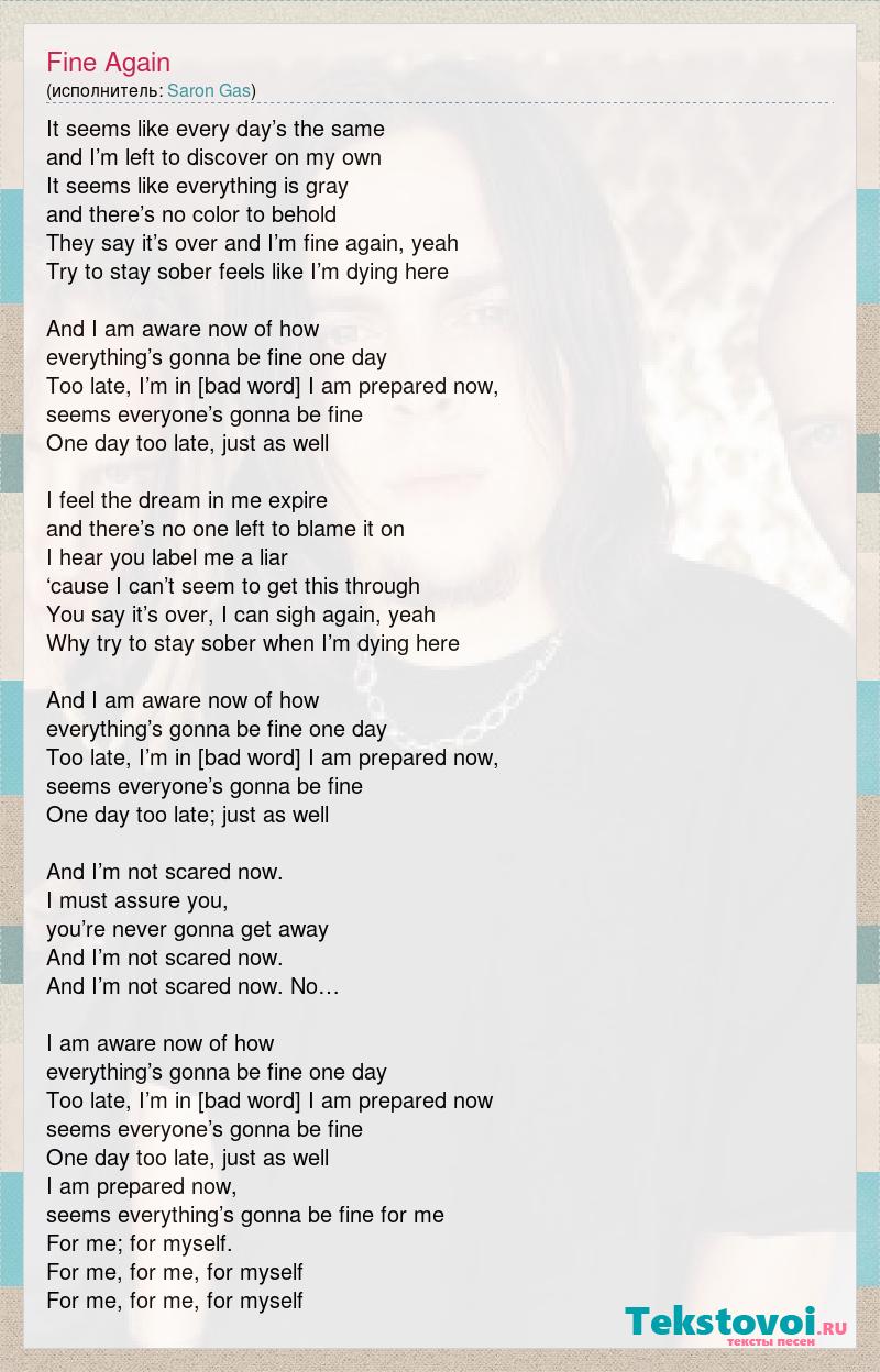 It seems like every day’s the same and I’m left to discover on my own It seems like everything is gray and there’s no color to behold They say it’s over and I’m fine again, yeah Try to stay sober feels like I’m dying here And I am aware now of how everything’s gonna be fine one day Too late, I’m in [bad word] I am prepared now, seems everyone’s gonna be fine One day too late, just as well I feel the dream in me expire and there’s no one left to blame it on I hear you label me a liar ‘cause I can’t seem to get this through You say it’s over, I can sigh again, yeah Why try to stay sober when I’m dying here And I am aware now of how everything’s gonna be fine one day Too late, I’m in [bad word] I am prepared now, seems everyone’s gonna be fine One day too late; just as well And I’m not scared now. I must assure you, you’re never gonna get away And I’m not scared now. And I’m not scared now. No… I am aware now of how everything’s gonna be fine one day Too late, I’m in [bad word] I am prepared now seems everyone’s gonna be fine One day too late, just as well I am prepared now, seems everything’s gonna be fine for me For me; for myself. For me, for me, for myself For me, for me, for myself