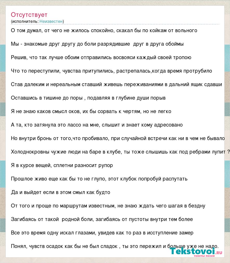 О том думал, от чего не жилось спокойно, скакал бы по койкам от вольного Мы - знакомые друг другу до боли разрядившие друг в друга обоймы Решив, что так лучше обоим отправились восвояси каждый своей тропою Что то переступили, чувства притупились, растрепалась,когда время протрубило Став далеким и нереальным ставший живешь переживаниями в дальний ящик сдавши Оставшись в тишине до поры , подавляя в глубине души порыв Я не знаю каков смысл оков, их бы сорвать к чертям, но не легко А та, кто затянула это лассо на мне, слышит и знает кому адресовано Но внутри бронь от того,что пробивало, при случайной встречи как ни в чем не бывало Холоднокровны чужие люди на баре в клубе, ты тоже слышишь как под ребрами лупит ? Я в курсе вещей, сплетни разносит рупор Прошлое живо еще как бы то не глупо, этот клубок попробуй распутать Да и выйдет если в этом смыл как будто От того и проще по маршрутам известным, не знаю ждать чего шагая в бездну Загибаясь от такой родной боли, загибаясь от пустоты внутри тем более Все это время одну искал глазами, увидев как то раз в исступление замер Понял, чувств осадок как бы не был сладок , ты это пережил и больше уже не надо.