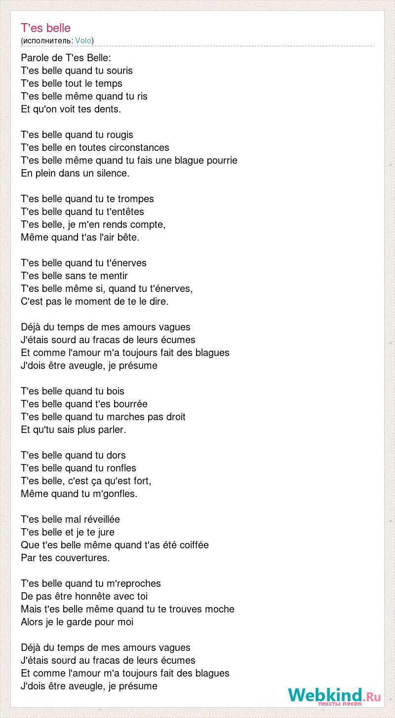Parole de T'es Belle: T'es belle quand tu souris T'es belle tout le temps T'es belle même quand tu ris Et qu'on voit tes dents. T'es belle quand tu rougis T'es belle en toutes circonstances T'es belle même quand tu fais une blague pourrie En plein dans un silence. T'es belle quand tu te trompes T'es belle quand tu t'entêtes T'es belle, je m'en [bad word] Même quand t'as l'air bête. T'es belle quand tu t'énerves T'es belle sans te mentir T'es belle même si, quand tu t'énerves, C'est pas le moment de te le dire. Déjà du temps de mes amours vagues J'étais sourd au fracas de leurs écumes [bad word] l'amour m'a toujours fait des blagues J'dois être aveugle, je présume T'es belle quand tu bois T'es belle quand t'es bourrée T'es belle quand tu marches pas droit Et qu'tu sais plus parler. T'es belle quand tu dors T'es belle quand tu ronfles T'es belle, c'est ça qu'est fort, Même quand tu m'gonfles. T'es belle mal réveillée T'es belle et je te jure Que t'es belle même quand t'as été coiffée Par tes couvertures. T'es belle quand tu m'reproches De pas être honnête avec toi Mais t'es belle même quand tu te trouves moche Alors je le garde pour moi Déjà du temps de mes amours vagues J'étais sourd au fracas de leurs écumes [bad word] l'amour m'a toujours fait des blagues J'dois être aveugle, je présume