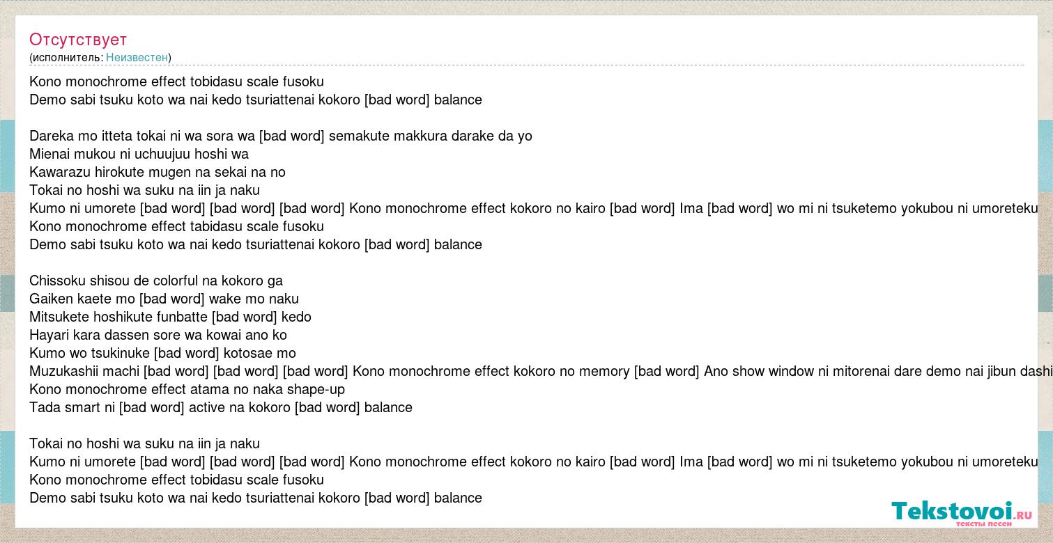 Kono monochrome effect tobidasu scale fusoku Demo sabi tsuku koto wa nai kedo tsuriattenai kokoro [bad word] balance Dareka mo itteta tokai ni wa sora wa [bad word] semakute makkura darake da yo Mienai mukou ni uchuujuu hoshi wa Kawarazu hirokute mugen na sekai na no Tokai no hoshi wa suku na iin ja naku Kumo ni umorete [bad word] [bad word] [bad word] Kono monochrome effect kokoro no kairo [bad word] Ima [bad word] wo mi ni tsuketemo yokubou ni umoreteku Kono monochrome effect tabidasu scale fusoku Demo sabi tsuku koto wa nai kedo tsuriattenai kokoro [bad word] balance Chissoku shisou de colorful na kokoro ga Gaiken kaete mo [bad word] wake mo naku Mitsukete hoshikute funbatte [bad word] kedo Hayari kara dassen sore wa kowai ano ko Kumo wo tsukinuke [bad word] kotosae mo Muzukashii machi [bad word] [bad word] [bad word] Kono monochrome effect kokoro no memory [bad word] Ano show window ni mitorenai dare demo nai jibun dashi Kono monochrome effect atama no naka shape-up Tada smart ni [bad word] active na kokoro [bad word] balance Tokai no hoshi wa suku na iin ja naku Kumo ni umorete [bad word] [bad word] [bad word] Kono monochrome effect kokoro no kairo [bad word] Ima [bad word] wo mi ni tsuketemo yokubou ni umoreteku Kono monochrome effect tobidasu scale fusoku Demo sabi tsuku koto wa nai kedo tsuriattenai kokoro [bad word] balance