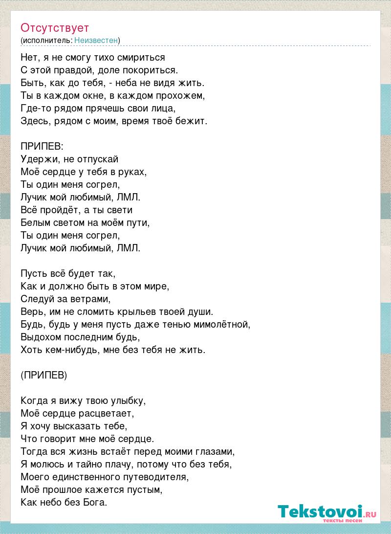 Нет, я не смогу тихо смириться С этой правдой, доле покориться. Быть, как до тебя, - неба не видя жить. Ты в каждом окне, в каждом прохожем, Где-то рядом прячешь свои лица, Здесь, рядом с моим, время твоё бежит. ПРИПЕВ: Удержи, не отпускай Моё сердце у тебя в руках, Ты один меня согрел, Лучик мой любимый, ЛМЛ. Всё пройдёт, а ты свети Белым светом на моём пути, Ты один меня согрел, Лучик мой любимый, ЛМЛ. Пусть всё будет так, Как и должно быть в этом мире, Следуй за ветрами, Верь, им не сломить крыльев твоей души. Будь, будь у меня пусть даже тенью мимолётной, Выдохом последним будь, Хоть кем-нибудь, мне без тебя не жить. (ПРИПЕВ) Когда я вижу твою улыбку, Моё сердце расцветает, Я хочу высказать тебе, Что говорит мне моё сердце. Тогда вся жизнь встаёт перед моими глазами, Я молюсь и тайно плачу, потому что без тебя, Моего единственного путеводителя, Моё прошлое кажется пустым, Как небо без Бога.