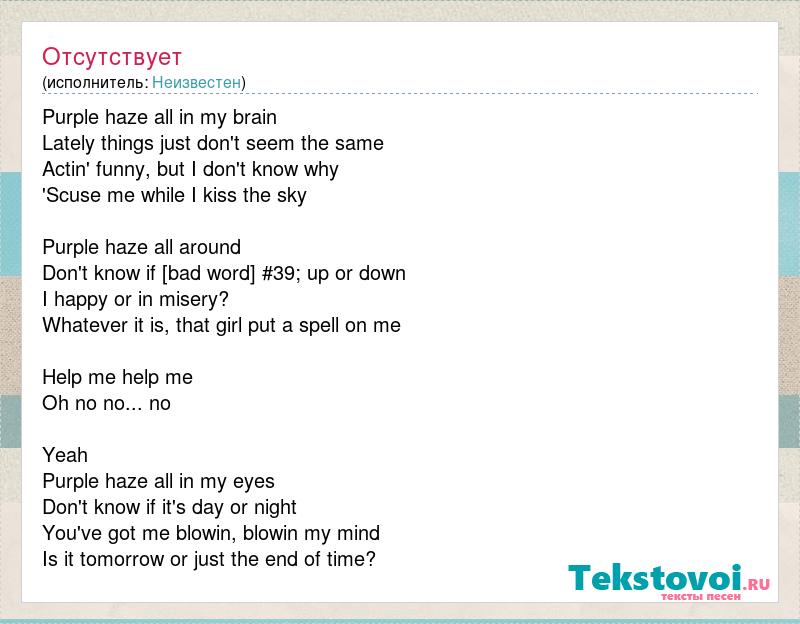 Purple haze all in my brain Lately things just don't seem the same Actin' funny, but I don't know why 'Scuse me while I kiss the sky Purple haze all around Don't know if [bad word] #39; up or down I happy or in misery? Whatever it is, that girl put a spell on me Help me help me Oh no no... no Yeah Purple haze all in my eyes Don't know if it's day or night You've got me blowin, blowin my mind Is it tomorrow or just the end of time?