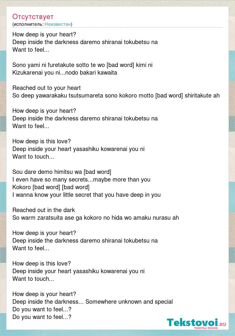 How deep is your heart? Deep inside the darkness daremo shiranai tokubetsu na Want to feel... Sono yami ni furetakute sotto te wo [bad word] kimi ni Kizukarenai you ni...nodo bakari kawaita Reached out to your heart So deep yawarakaku tsutsumareta sono kokoro motto [bad word] shiritakute ah How deep is your heart? Deep inside the darkness daremo shiranai tokubetsu na Want to feel... How deep is this love? Deep inside your heart yasashiku kowarenai you ni Want to touch... Sou dare demo himitsu wa [bad word] I even have so many secrets...maybe more than you Kokoro [bad word] [bad word] I wanna know your little secret that you have deep in you Reached out in the dark So warm zaratsuita ase ga kokoro no hida wo amaku nurasu ah How deep is your heart? Deep inside the darkness daremo shiranai tokubetsu na Want to feel... How deep is this love? Deep inside your heart yasashiku kowarenai you ni Want to touch... How deep is your heart? Deep inside the darkness... Somewhere unknown and special Do you want to feel...? Do you want to feel...?